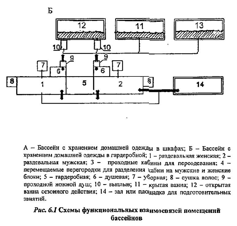 5.4 Высоту помещений для размещения бассейнов длиной 10 м и более, измеряемую от поверхности обходной дорожки вокруг бассейна до низа выступающих конструкций, следует принимать не менее 6 м.