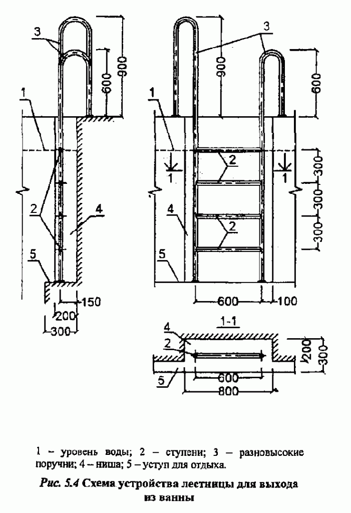 5.15 В ваннах бассейнов следует предусматривать лестницы для выхода из воды. В ваннах бассейнов длиной 16 и 25 м - 2 лестницы, расположенные с каждой продольной стороны. Лестницы следует размещать в нишах, заглубляя их по отношению к плоскости стенок ванн. Схема устройства лестницы для входа/выхода из воды приведена на рисунке 5.4. Поручни лестницы выполняются разновысокими для удобного пользования посетителей разного роста. Лестницы располагаются не ближе 3 и не далее 5 м от торцевых стенок бассейна. Предпочтительными следует считать плоские ступени лестницы.