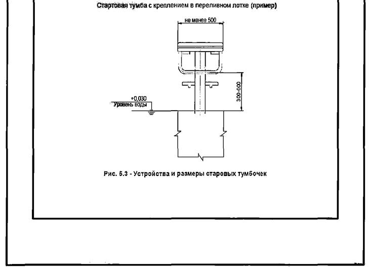 5.12 Стартовые тумбы для проведения соревнований (рисунок 5.3) предусматриваются для бассейнов длиной 16 и 25 м. Тумбы следует располагать со стороны бассейна глубиной 1, 8 м.