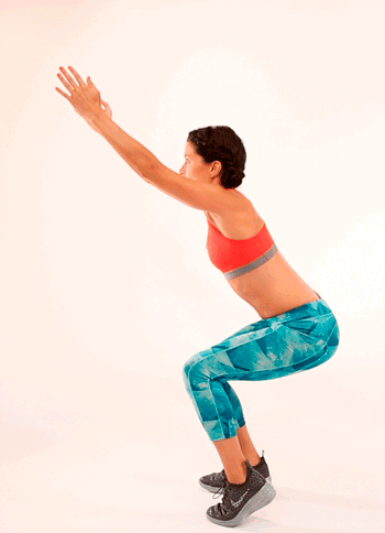 Принимаем исходное положение для базового приседа и опускаемся в нижнюю точку. Затем отводим руки назад и выпрыгиваем из положения «сидя» максимально высоко, отталкиваясь от пола всей ступней.