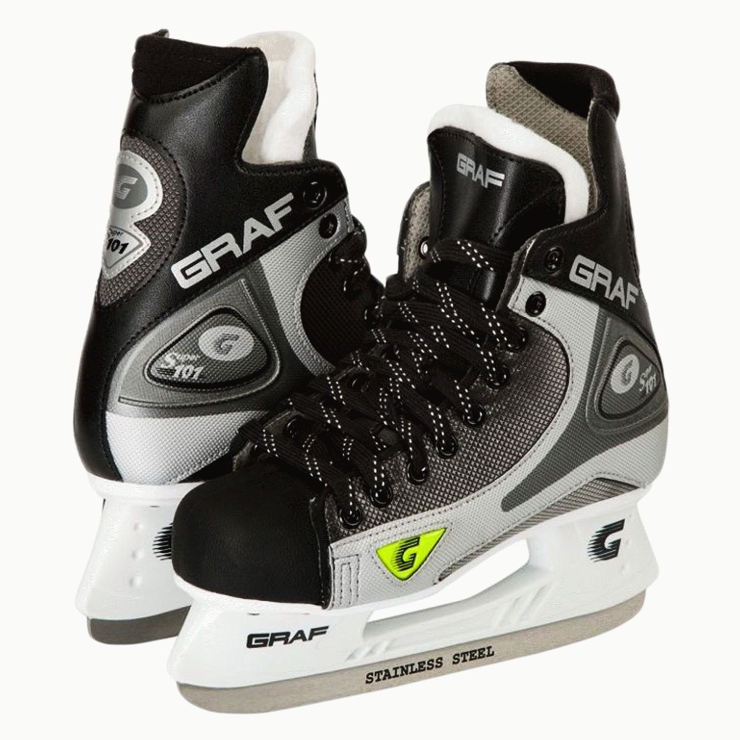 - Уровень мастерства. Отталкивайтесь от поставленных задач. Будучи новичком, лучше купить коньки для начинающих. Отлично подойдут начальные модели, например, фирмы Graf. Тем, кто хочет активно кататься или заняться хоккеем на любительском уровне следует присмотреться к недорогим полупрофессиональным хоккейным конькам, которые выполнены из прочных материалов и защитят ноги от ударов шайбы, лезвий чужих коньков, холода. Профессионалам не подойдут модели для новичков и любителей, так как из-за недостаточной жёсткости они быстро придут в негодность и не обеспечат необходимого уровня защиты при активном/агрессивном катании. Выбирать таким спортсменам нужно продвинутые хоккейные коньки совсем из других ценовых категорий.