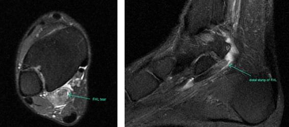 Прежде всего, это боль по задне-внутренней поверхности голеностопного сустава. Возможно «защёлкивание» большого пальца при его сгибании. Хруст, крепитация по задне-внутренней поверхности голеностопного сустава при активных движениях. При физикальном осмотре определяется боль при сгибании большого пальца через сопротивление, при форсированном подошвенном сгибании в голеностопном суставе, при этом боль отсутствует в области первого плюсне-фалангового сустава. Для диагностики повреждения сухожилия длинного сгибателя большого пальца стопы целесообразно выполнение МРТ, при этом обнаруживается скопление жидкости вокруг сухожилия на уровне голеностопного сустава, изменение сигнала от самого сухожилия.