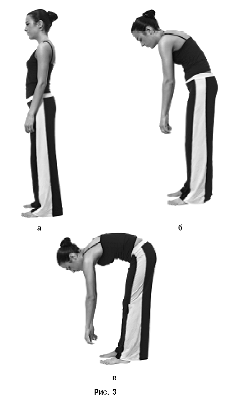 Начните с исходной позиции, ноги при этом расставьте чуть больше ширины плеч, а руки опустите (рис. 3а). Возьмите в руки свернутую газету или палочку; представьте, что это рукоятка насоса, а вы накачиваете шину автомобиля. Делаем легкий наклон вперед (рис. 3б), тянемся руками к полу, но самого пола не касаемся (рис. 3в). Во второй половине наклона делаем резкий вдох. Не забывайте, что ваш вдох должен быть хорошо слышен. Рассчитайте наклон так, чтобы он был ритмически связан с вдохом. Кончился наклон – кончился вдох. Не тяните вдох, разгибаясь, и не разгибайтесь до конца. Закончили наклон – слегка приподнимите туловище, но полностью спину не выпрямляйте.