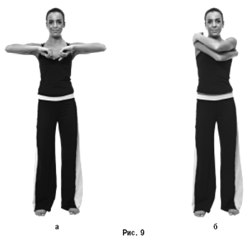Стали прямо, руки согнули в локтях, ладони повернули от себя (рис. 1а). Держите руки так, чтобы локти были направлены вниз, а не «гуляли» свободно из стороны в сторону. Начинайте делать шумные вдохи носом и одновременно сжимайте ладони в кулаки (рис. 1б). Словно схватили воздух и зажали, схватили и зажали. Запомните: вы делаете подряд 4 вдоха, обязательно резких и ритмичных. Можете даже включить маршевую музыку, это очень помогает во время занятий. Выполнили один цикл, руки опустили, отдохнули 3-4 с. Снова работаем. Снова делаем 4 циклических вдоха носом.