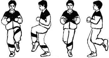 Надо поднять согнутую в коленном суставе левую ногу, отвести ее назад, прижимая пятку к ягодице, слегка согнуть в колене правую ногу, присесть и одновременна произвести резкий и шумный вдох. Далее следует вернуться в исходное положение, сделав спокойный выдох. После этого требуется согнуть в колене и отвести назад правую ногу, вновь прижав пятку к ягодице, в то же время слегка согнуть в коленном суставе левую ногу, немного присесть и сделать короткий и активный вдох. Затем следует принять исходное положение, сопровождая движения самопроизвольным выдохом.