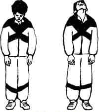Не перекрещивая, требуется завести руки как можно дальше за спину, проведя одну под мышкой, а вторую — поверх плеча, одновременно производя резкий и шумный вдох. После этого вернуть руки в исходное положение и в тот же момент легко и медленно выдохнуть. Стоит заметить, что для того, чтобы сделать выдох в таком положении, нет необходимости прикладывать какие бы то ни было усилия. Он производится самопроизвольно при разведении рук и вследствие следующего за тем расширения грудной клетки.