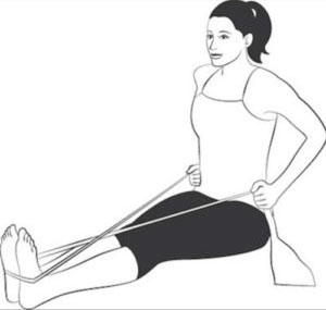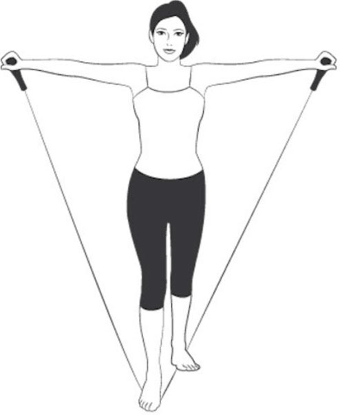 Садятся на пол и вытягивают ноги перед собой. На ступнях фиксируют середину эластичной ленты и скрещивают на концах, чтобы образовалась буква «X», а концы ленты, удерживаемые в руках, разводят в стороны, а затем тянут к бедрам, сгибая руки в локтях. Руки направляют вверх. Задерживаются и медленно возвращаются в начальное положение. Выполняют три цикла по 8-12 повторений в каждом.