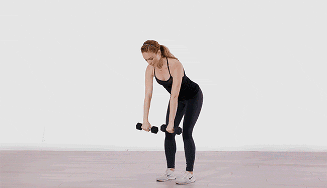 - Ноги ставят на ширину бедер. В руках над бедрами держат нетяжелые гантели. Исходная позиция аналогична той, что принимают при наклонной тяге.