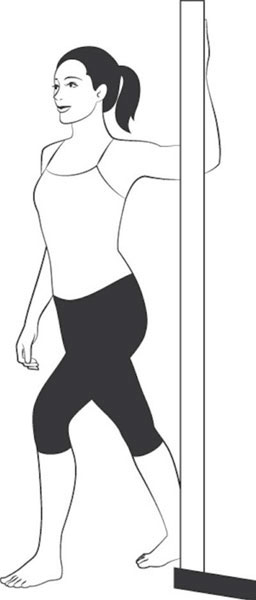 Становятся в дверном проеме. Руку вытягивают параллельно полу, сгибают локоть. Пальцы должны при этом быть направлены вверх. Руку ставят на дверной косяк.