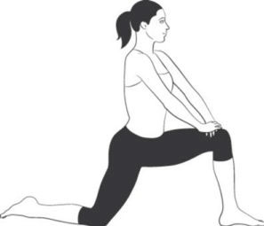 Становятся на правое колено. Левую ногу ставят перед собой. Пальцы прижаты к полу. Ладони кладут на колено левой ноги и выдвигают таз вперед, останавливаясь лишь тогда, когда в сгибателях бедер ощущается напряжение. Напрягают мышцы пресса и отводят таз немного назад. Подбородок держат параллельным полу. Остаются в принятом положении от 20 и до 30 секунд, а затем меняют сторону.