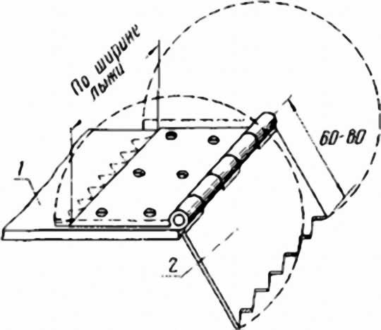Если приходится охотиться в горных местах или холмистой местности, а у вас нет камуса, можно изготовить несложный упор, который показан на рис. 6. Ширина его выбираете я по ширине лыжи. Изготавливать упор желательно из цветного металла. В случае необходимости его всегда можно откинуть на лыжу. Можно использовать стандартные навесы, выпилив зубцы. Шарнир навеса нужно регулярно смазывать и следить за ним, чтобы он не засорялся и не ржавел.