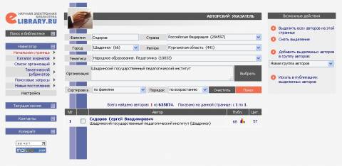 На сайте elibrary.ru в меню слева нажмите Авторский поиск (или перейдите по этой ссылке ), заполните открывшуюся форму и кликните Поиск.