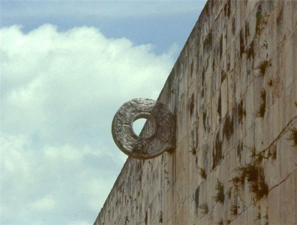 Индейцы майя играли в ритуальный футбол каучуковым мячом, а в качестве ворот необходимо было попасть вот в такое кольцо, прикрепленное к стене.