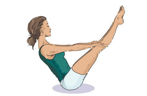 Сидя на полу, ступни касаются земли. Поднимите ноги и подтяните их к груди, стараясь обхватить колени руками, не касаясь их.