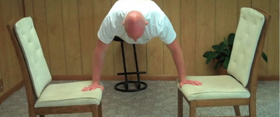 Следующим вариантом отжимания является отжимание на табуретках. Две табуретки ставятся на ширине плеч, в качестве подставки под ноги используется диван либо кресло. Исходное положение как при обычном отжимании. Главное отличие заключается в том, что в данной вариации отжиманий увеличивается глубина опускания тела. Так же в данном упражнении возможна работа с отягощением, например, в качестве дополнительного груза можно использовать рюкзак с книгами.