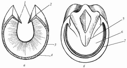 Рис. 2. Копыто лошади (вид снизу): а – роговая стенка; б – подошва и стрелка; 1 – заворотная часть; 2 – пяточный угол; 3 – боковая часть; 4 – зацепная часть; 5 – стрелка; 6 – подошва; 7 – белая линия
