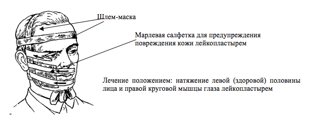 Лейкопластырное натяжение в первые дни заболевания проводят дробно: по 30-60 минут 2-3 раза в день (преимущественно во время активных мимических действий: при приеме пищи, разговоре, общении с родственниками и врачами), затем - по 2-3 часа.