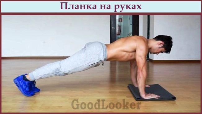 Следите за техникой: таз подкручен, колени прямые, кистевые суставы строго под плечами, поясница не прогибается.