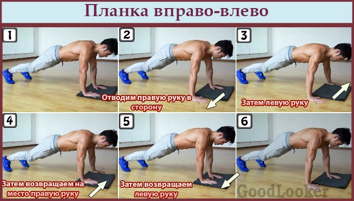 Встаньте в классическую планку на руках. Из этого положения шагните правой рукой вперед, перенеся вес тела на левую опорную руку, вернитесь в исходное положение, передвинув руку назад, и выполните шаг левой рукой. Продолжайте упражнение в динамике, сколько позволит выносливость.
