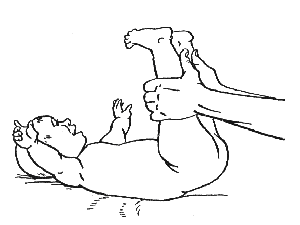 Упражнение способствует развитию и укреплению мышц и суставов ребенка. Для его выполнения нужно взять ребенка за голени, причем большие пальцы должны захватить низ голени, а остальные находиться на коленных чашечках.