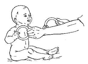 Методику проведения данного упражнения описана выше. Когда ребенку исполнится 8 месяцев, упражнение следует усложнить. Малыш должен выполнять его из положения сидя, держась за вложенные в его руки кольца.