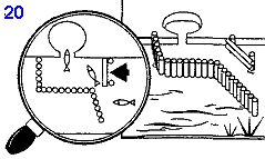 В тупиковой части садка надо выкопать загон-ловушку в форме глубокой ямы, соединенной с рекой узким длинным канальцем. Когда рыба попадет в садок, ее надо, производя как можно больше шума, загнать в ловушку и закрыть из нее выход (рис. 20). В стоячих водоемах ловушки выполняются в форме лабиринтов, состоящих из множества соединенных друг с другом полукругов и спиралей. Роль входа выполняют два расположенных близко друг к другу полукруга, образующих узкий фигурный коридор. Сооружается такая ловушка также из вбитых в дно кольев, для прочности соединенных друг с другом проволокой, веревкой или любым другим подручным материалом.