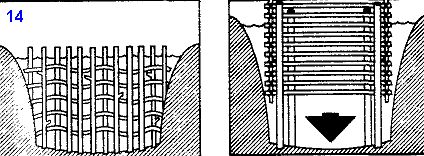 Для большей надежности, особенно если для строительства используются кривые заготовки, вертикальные колья можно переплести поперечными ветками, веревками или полосами лыка до получения классической формы сети (рис. 14). Кроме того, сети могут иметь вид опускаемых в воду «плетней», где к двум-трем вертикальным стойкам прикрепляются длинные прямые жерди. Чтобы такая сеть стояла вертикально и не сносилась потоком, ее надо прикрепить к заранее вбитым в дно кольям (рис. 14).