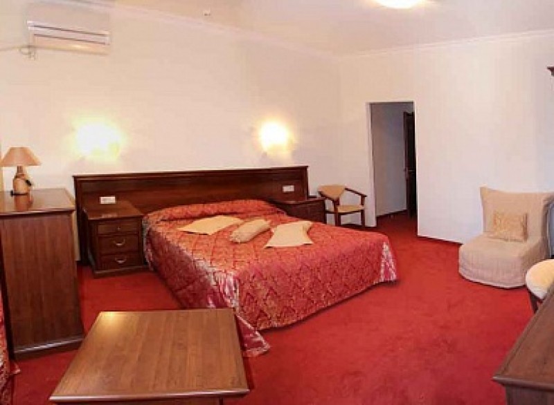 Однокомнатные номера категории «Джуниор Сюит»: площадь номеров 25 кв.м., с лоджией. В каждом номере: телевизор, мини-бар, телефон, набор посуды, сплит-система (фото номера вверху справа красное коворовое покрытие).
