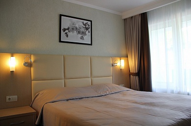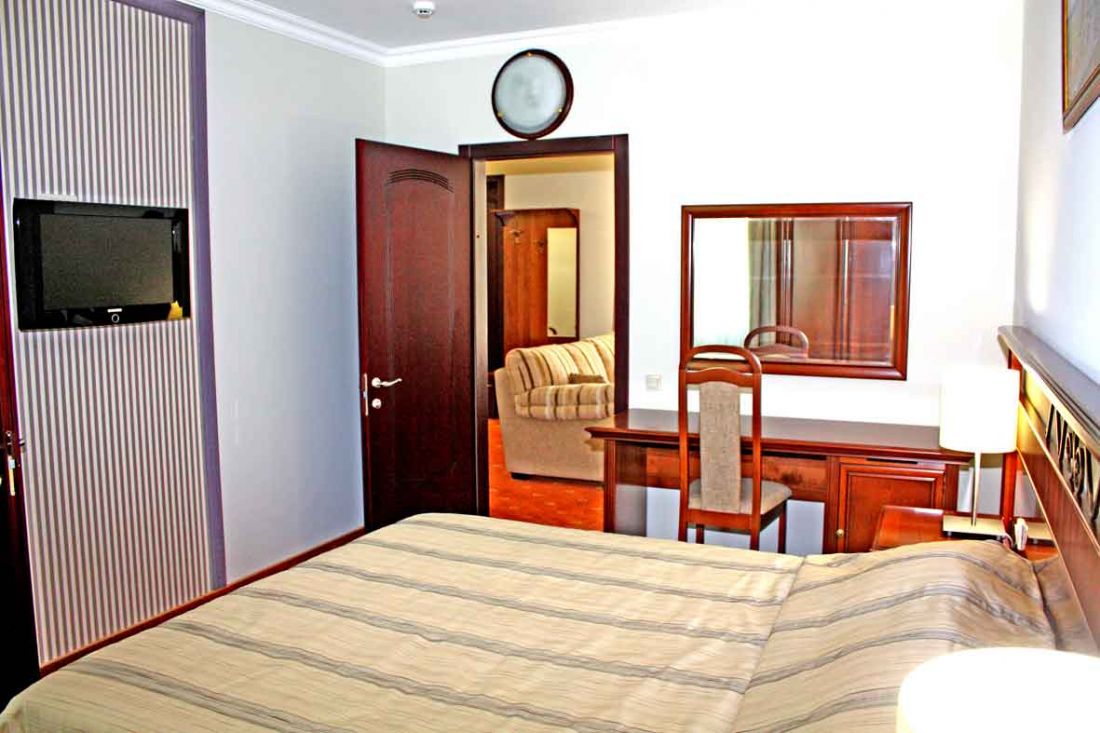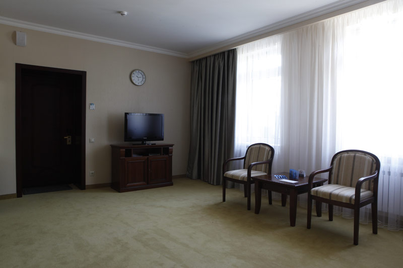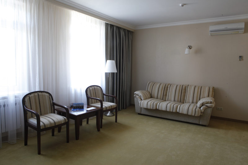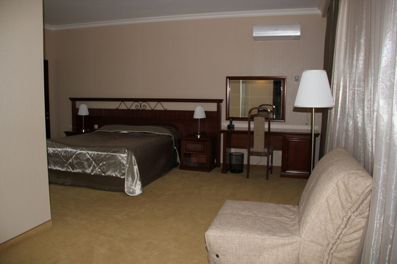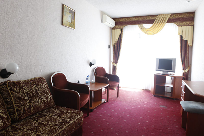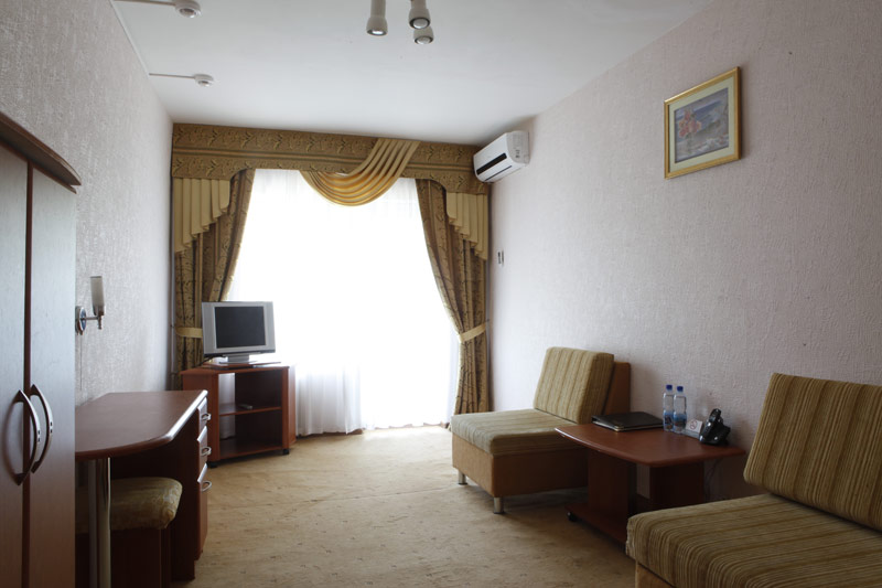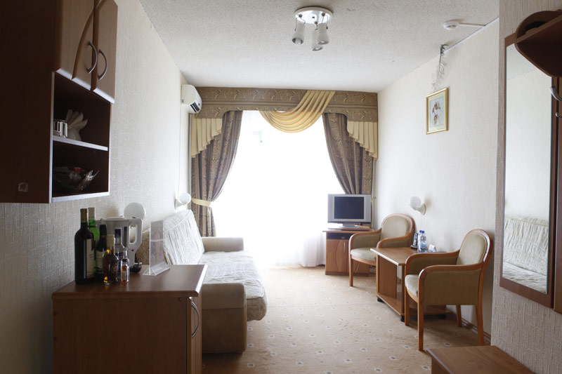 - 2-х местный номер джуниор сюит. В номерах: душ/ванна, туалет, ТВ, фен (по запросу), мини-бар, сплит-система, телефон, электрочайник, сейф, Wi-Fi, балкон.