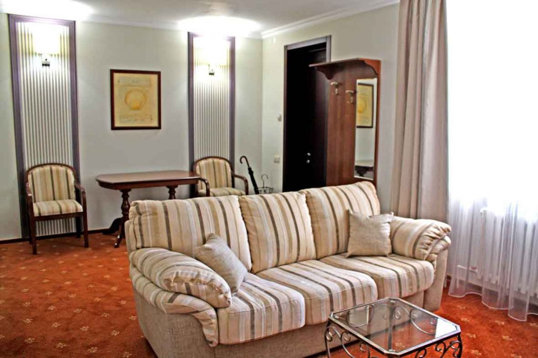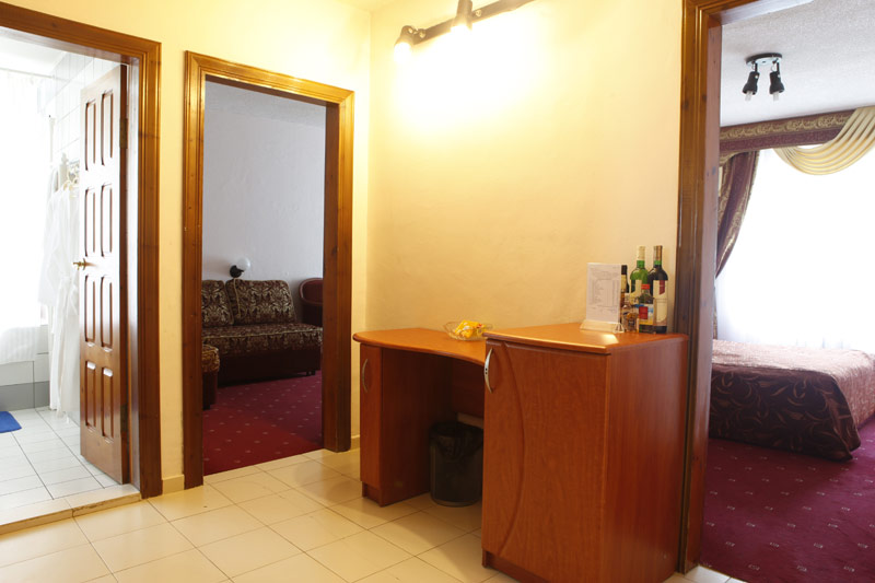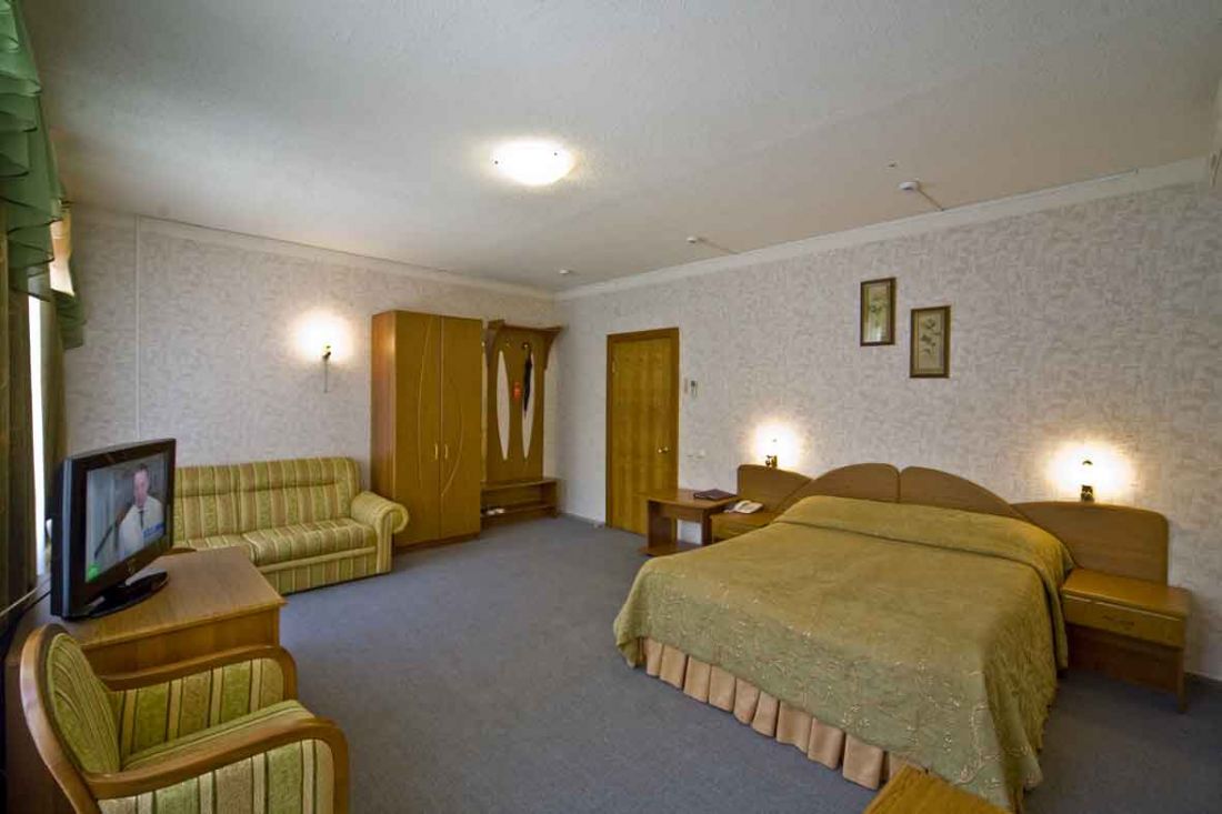 - 2-х местный 2-х комнатный номер люкс. В номере: душ/ванна, туалет, ТВ, холодильник, сплит-система, телефон, сейф, фен, халат и тапочки, электрочайник, Wi-Fi, две односпальные кровати и раскладной диван;