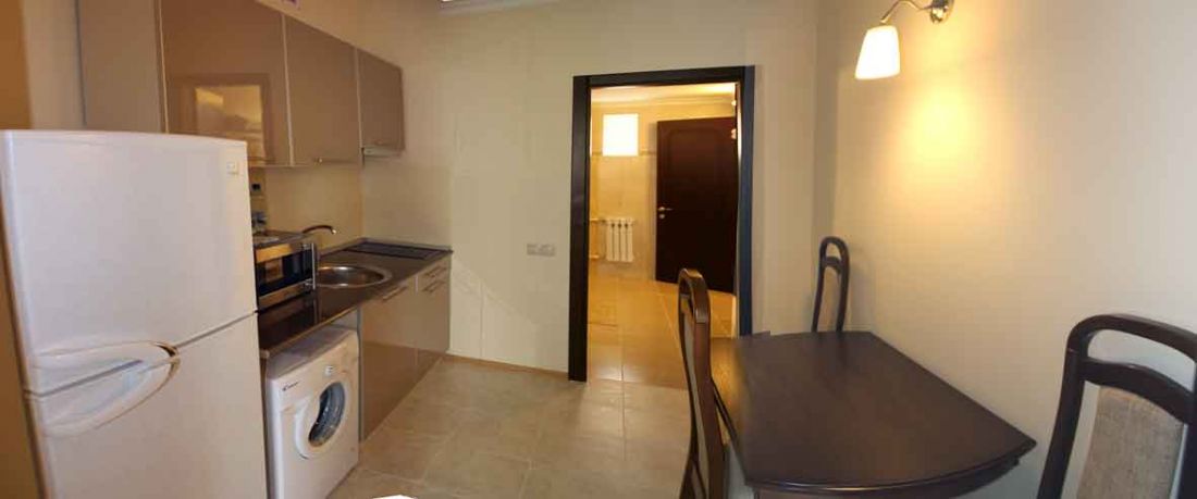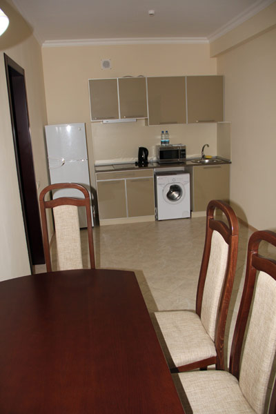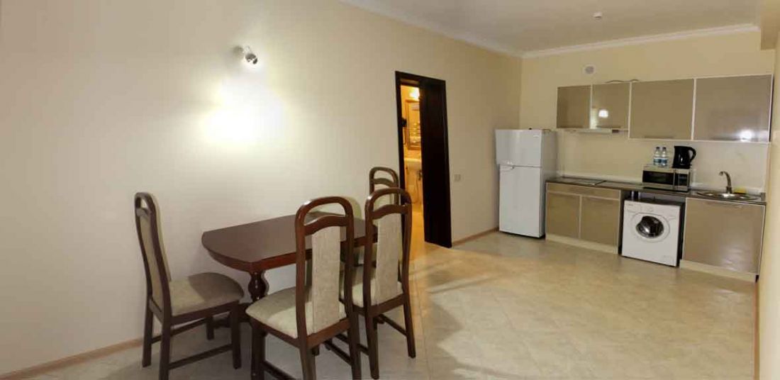 «Апартамент» c лоджией, состоящие из спальной комнаты, гостиной, кухни. Площадь номера 48 кв.м. Все номера оборудованы холодильниками, телевизорами, сплит-системами, необходимой бытовой техникой, сейфами, предусмотрено дополнительное место.