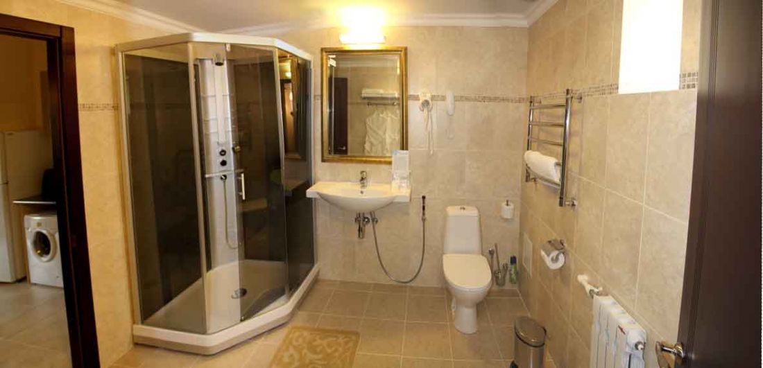 - 2-х местный номер апартаменты. В номере: душ/ванна, туалет, два ТВ, холодильник, сплит-система, телефон, сейф, фен, халат и тапочки, гладильная доска, утюг, электрочайник, набор посуды, СВЧ-печь, Wi-Fi;