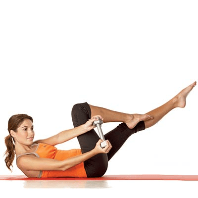 Сядьте на пол. Колени согнуты, ступни на полу. Обхватите бедра руками, отклонитесь назад и поднимите ступни пока ноги не будут параллельны полу. Выпрямите ноги и потянитесь к пальцам ног. Задержитесь на 8 вдохов. Повторите 3 раза.