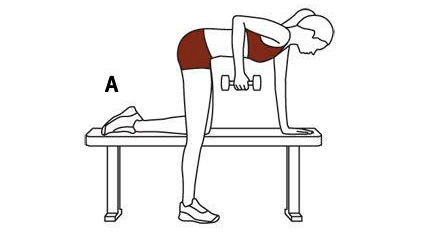 Чтобы принять исходную позицию, на скамью кладут левую ладонь и левое колено. Правую руку, в которой находится гантель, держат параллельно к телу, сгибают под прямым углом (рисунок A).