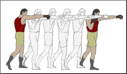 Дальнейшее движение вперед предусматривает удар правой рукой с шагом левой ногой вперед.