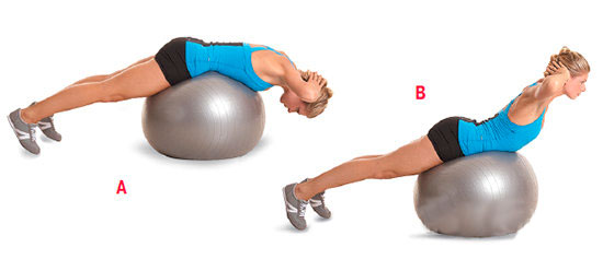 | Для выполнения данного упражнения нужно лечь животом на мяч. При этом пальцы ног должны соприкасаться с полом, а пятки – упираться в стену. Удерживая руки над головой, медленно поднимайте тело над полом, затем так же медленно опускайтесь. Упражнение следует повторить 10-12 раз. |