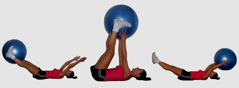 Снова лягте на спину, фитбол разместите между ног и поднимите ноги вверх вместе с ним, руками упритесь в пол (А). Теперь наклоните ноги влево, не отрывая плечевой отдел от пола (В), затем сделайте наклон вправо и вернитесь в исходное положение (А). Один повтор вы сделали.