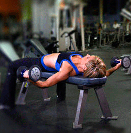 | 5 | Отлично подходит для тренировки грудных мышц гимнастическая скамейка. Ложитесь на нее спиной, в руках держите гантели и прижмите их к груди. На вдохе разводите руки в стороны, с выдохом возвращайте в исходное положение. Пара подходов по 10 раз отлично подтягивают и увеличивают бюст. |