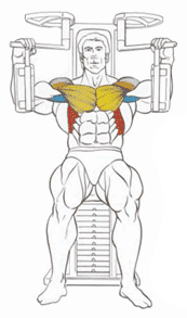 Техника выполнения: отрегулируйте высоту сиденья тренажера таким образом, чтобы ручки были на уровне груди. Сядьте в тренажер и упритесь спиной в спинку. Вдохните, на выдохе начните сводить ручки тренажера перед собой. В конечной точке траектории сожмите и максимально напрягите грудные мышцы удерживая пиковое сокращение в течение 1-2 секунд. Медленно и подконтрольно вернитесь в исходное положение.