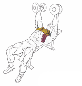 Это упражнение с гантелями является лидером среди изолированных. При его выполнении работе работает один плечевой сустав, то есть основное усилие сосредоточено на грудных мышцах.