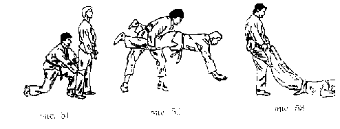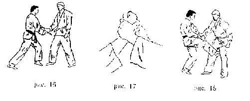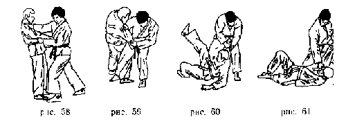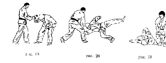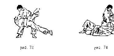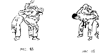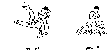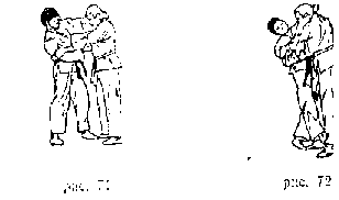 Передняя подножка . Захватить правой рукой ворот одежды противника, левой - правый рукав у локтя. Поворачиваясь налево кругом, левую ногу поставить около левой ноги противника, правую - впереди его правой ноги так, чтобы подколенный сгиб ноги упирался в колено одноименной ноги противника. Потянув противника на себя и поворачиваясь к нему спиной, бросить его через свою ногу на спину (рис. 138).