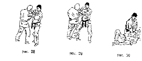 3. С шагом правой ноги выполнить перехват левой рукой от локтя и кисти таким образом, чтобы сильно согнутая в локте рука противника оказалась как можно глубже в вашей подмышечной впадине, будучи прижатой вашей левой рукой к своему боку. Правая рука помогает удерживать кисть противника в согнутом состоянии (рис. 28).
