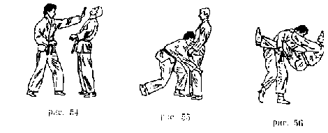 Помощь при захватах . Выполняется при захватах за гор-ло, одежду, руки - ударами рукой или ногой, болевыми или удушающими приемами (рис. 153, 154, 155, 156).