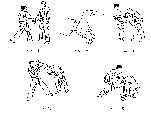 Освобождения от захватов и обхватов . Выполняются от захватов запястий, предплечий,- рукавов сверху, снизу одной или двумя руками - рывком в сторону больших пальцев противника (рис. 140-1,2,3,4.5); за горло (одежду на груди) - выбиванием вверх предплечьями (рис. 140-6); от обхватов за туловище спереди, (сзади) с захватом рук, без захвата рук - отставлением ноги назад с нажимом пальцами на глаза или ребром ладони под основание но-са, ударом коленом в область паха, (каблуком по подъему ноги) (рис. 140-7,8,9,10); от захватов ноги (ног) спереди - отставлени-ем ноги назад, ударом локтем в позвоночник (лицо), скручиванием головы (рис. 140-11); от захватов ног сзади - падением вперед на руки с подведением одной ноги коленом к животу с последующим нанесением удара в лицо (грудь) противнику; от захватов горла (шеи) плечом и предплечьем сзади - ударом локтем назад в солнечное сплетение, приседанием с захватом руки, ударом пяткой (каблуком) назад в голень или сверху вниз по подъему стопы с поворотом к противнику или броском через спину; от захватов шеи плечом и предплечьем сбоку - ударом кулаком дальней руки в пах, нажимом пальцами ближней руки на глаза (через плечо противника)