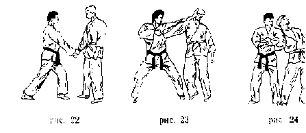 С шагом левой ногой влево - вперед к правой ноге противника (партнера) захватить правой рукой предплечье его одноименной руки изнутри (рис. 22), потянуть захваченную руку на себя, одновременно нанести левой рукой удар в голову (рис. 23), поворачиваясь к противнику левым боком, перенести свою левую руку через его правую; подводя предплечье этой руки под его локтевой сгиб, захватить левой ру- кой свое правое предплечье из-под руки противника (партнера) (рис. 24).
