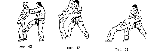 . Нанести удар стопой в подколенный изгиб противника, одновременно рвануть его руками за плечи на себя. Захватить предплечьем и пле-чом своей руки горло противника и, соединив руки, сдавливать его
